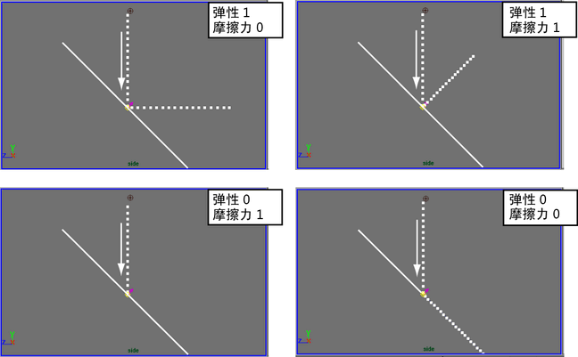 值为 0 意味着粒子不受摩擦力的影响。值为 1 表示粒子完全沿曲面法线反射。如果“弹性”(Resilience)为 0,而“摩擦力”(Friction)为 1,则粒子不反弹。