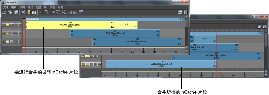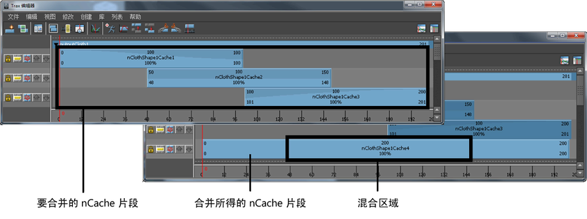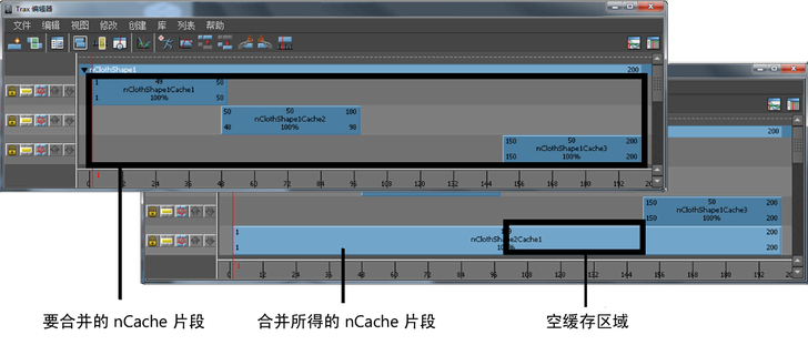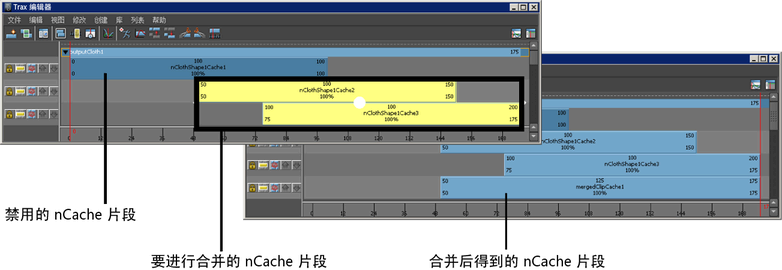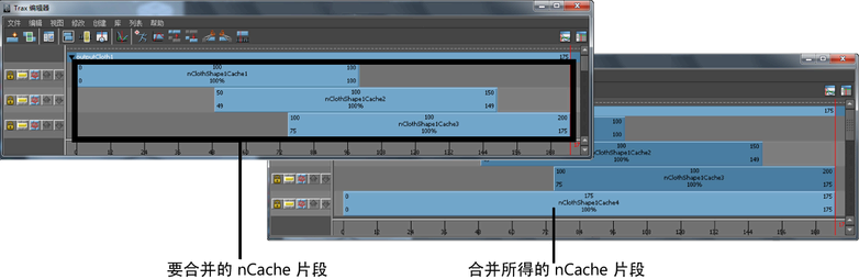 所有选定的非重叠 nCaches 将根据“合并缓存片段选项”(Merge Cache Clip Options)窗口中的设置进行合并,并创建新的 nCache 片段、缓存文件和描述文件。请参见“Trax 编辑器”(Trax Editor)的“编辑”(Edit)菜单。
