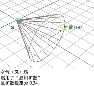 表示与“方向”(Direction)设置所成的角度,该角度内的对象会受到空气场的影响。当启用“启用扩散”(Enable Spread)时,空气场将从其原点以类似圆锥的形状推进。
