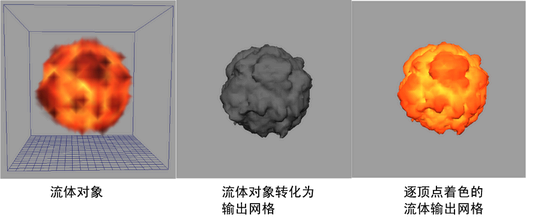 如果将流体对象转化为网格,则可以生成逐顶点数据,如网格对象的逐顶点着色和逐顶点速度。请参见输出网格逐顶点着色。