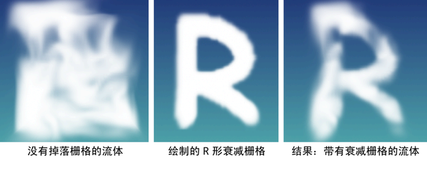 在下面的图像中,字母“R”使用“流体效果”(Fluid Effects)创建,它将像云扩散一样消失。流体体积中使用“湍流”(Turbulence)来进行推动。无论密度如何变化,衰减栅格将剪切出“R”形。