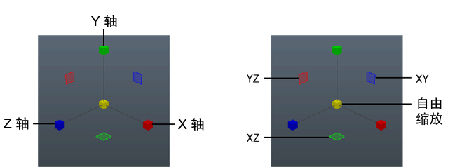 - 拖动平面控制柄以沿该平面的两个轴进行缩放。例如,拖动绿色的平面控制柄可沿 XZ 平面缩放。
