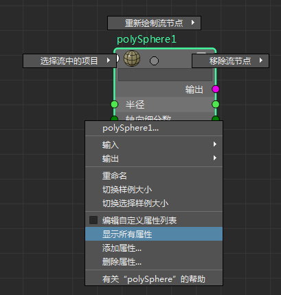 您可以从节点标记菜单中选择“显示所有属性”(Show All Attributes)选项,将节点的完全模式暂时替换为所有属性的列表。所有属性的显示仅对该绘制实例有效。如果对节点重新制图,或者更改节点的视图模式,则必须重新选择此选项才可再次显示其所有属性。请参见“节点编辑器”(Node Editor)标记菜单。对于没有关联自定义属性列表的节点,也可以使用热键 4 显示其所有属性。