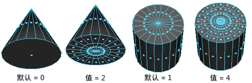 端面是圆锥体、圆柱体、棱柱、棱锥、管道和螺旋线的顶部、底部或侧面。该选项定义围绕基本体端面原点的细分数。在“通道盒”(Channel Box)和“属性编辑器”(Attribute Editor)中,该选项称为“端面细分数”(Subdivisions Cap)。增大或减小该值可添加或除去围绕端面的面。