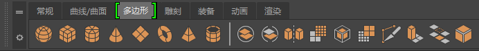 默认工具架分为多个选项卡,代表 Maya 中设置的每个主要工具。每个选项卡均包含许多图标,分别代表每个集最常用的命令。例如,“装备”(Rigging)选项卡包含“装备”(Rigging)菜单集中最常用命令的对应图标。