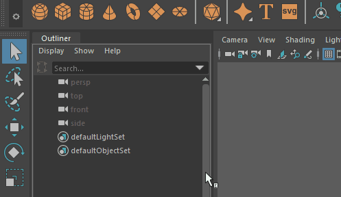“大纲视图”(Outliner)还会显示视图面板中通常隐藏的对象,如默认摄影机或没有几何体的节点(例如,着色器和材质)。可以使用相应“显示”(Display)和“显示”(Show)菜单中的项目,控制“大纲视图”(Outliner)中显示的节点。