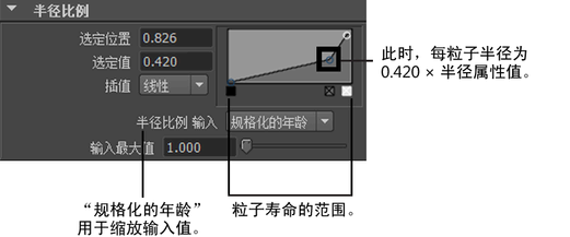 某些属性可以选择输入到渐变值,如以下示例中所示的随时间更改粒子的半径: