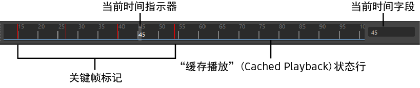 当前时间指示器是“时间滑块”(Time Slider)上的灰色块。可以拖动它以在动画中前后移动。