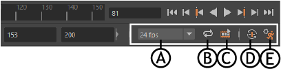 A.“帧速率”(Framerate)菜单 B.“循环”(Loop) C.“缓存播放”(Cached Playback) D.“自动关键帧”(Auto Key) E.“动画首选项”(Animation Preferences)