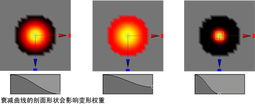 “颜色反馈”(Color Feedback)直观地指出了影响的区域,以及受影响区域内的影响和衰减量。受影响最大的区域(基于“衰减曲线”(Falloff Curve)的形状)显示为黄色。随着变形器的影响逐渐减弱,颜色渐变融合为较深的橙色/红色。影响区域中未变形的区域显示为黑色。“衰减半径”(Falloff Radius)外侧的区域显示为灰色。