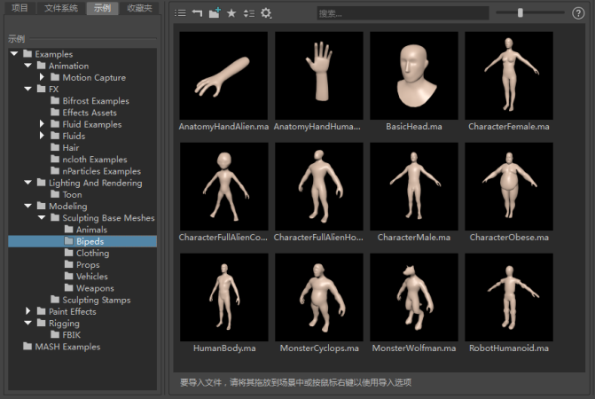 您可以加载包含模型的示例场景,作为您完成自我创作的起点。默认情况下,这些场景已随 Maya 一起安装。