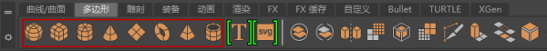 若要创建多边形基本体的 3D 对象,请打开“多边形”(Polygons)工具架,并单击左端处的任何 3D 形状图标。