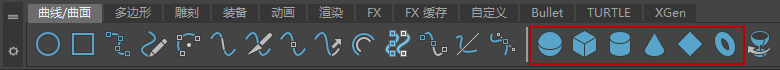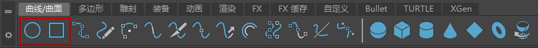 若要创建基本体 NURBS 曲线,请打开“曲线/曲面”(Curves/Surfaces)工具架,并单击左端的圆形或方形图标。