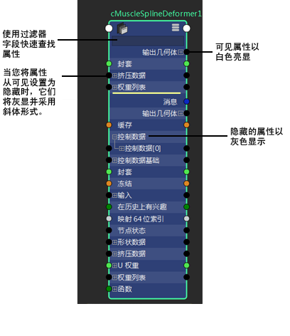 该节点将切换到编辑模式,并以黄色边框亮显。所有可见属性将以白色亮显。所有隐藏的属性将以灰色显示。