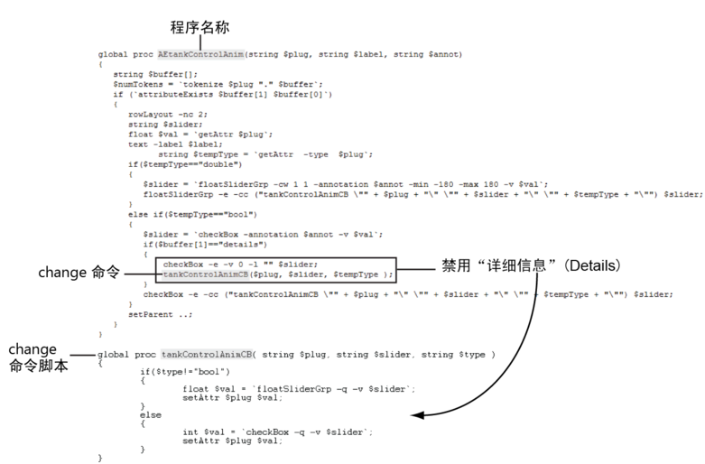 名为 tankControlAnimCB 的更改命令启动另一个脚本,从而确保在(Attribute Editor)属性编辑器布局中关闭(Details)细节复选框。