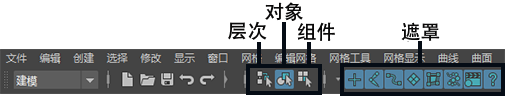 首次启动 Maya 时,选择模式将设置为“对象”(Object)。除少数例外情况外,该选项适用于 Maya 中的大多数选择操作。如果要选择已分组的项目,则将选择模式设定为“层次”(Hierarchy)。