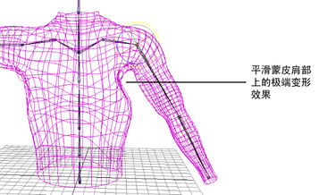 通过添加影响可抵消其他变形影响的影响对象,可以防止出现此类不需要的效果。例如,可以在肩部区域附近添加可抵消由平滑蒙皮产生的任何过度效果的影响对象。