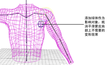 影响对象的一个重要作用是防止发生不需要的变形。平滑蒙皮完成后,可能会发现某些区域的变形超出预期。例如,在旋转肩部关节时,围绕肩部的变形可能过度。