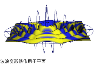 波浪变形器类似于正弦变形器。正弦变形器的正弦波浪按照 X 轴方向的相应振幅在变形器的局部 Y 轴传播。波浪变形器的正弦波浪按照 Y 轴方向的相应振幅沿变形器的局部 X 轴和 Z 轴传播。波浪变形器包括控制柄,可用于以直观的方式控制波浪效果的范围、振幅和波长。