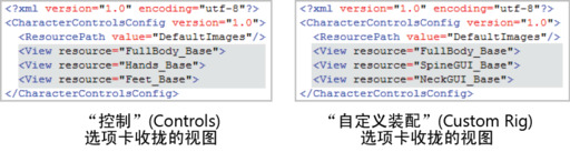 默认情况下,在安装期间 CharacterControlsConfig.xml 和 CustomRigControlsConfig.xml 在此目录中创建。这些文件用于创建“控制”(Controls)和“自定义装备”(Custom Rig)选项卡的默认布局。