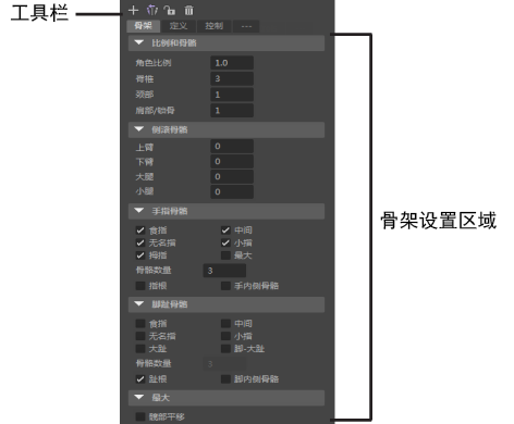 此选项卡用于创建 HumanIK 角色的骨架。