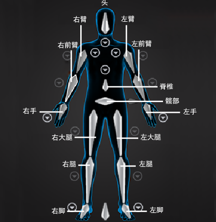 | 左臂和右臂 | 角色的上臂中的第一个骨骼。 |