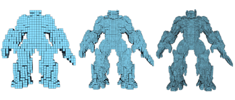 此示例显示了以不同分辨率体素化的角色网格。