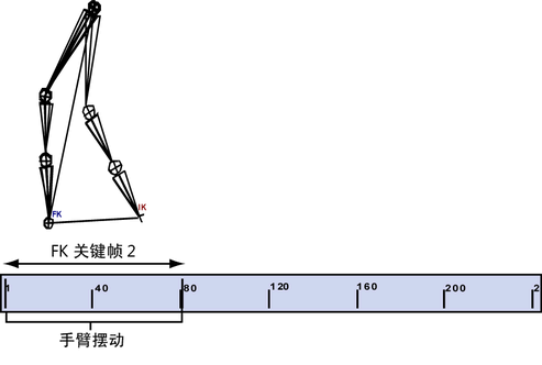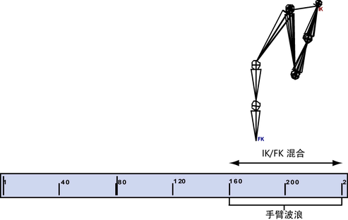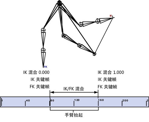 结果动画看起来像一个挥动的手臂 (FK),举高挥动 (IK),然后下降回到摆动动作(返回到 FK)。