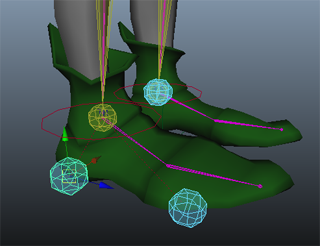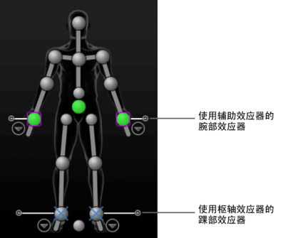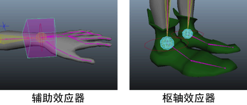 可以将辅助和枢轴效应器添加到角色控制装备,以提供其他级别的 IK 控制柄。请参见控制装备、效应器和枢轴