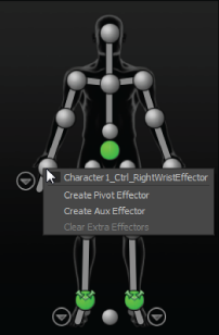 • 若要删除效应器的所有辅助和枢轴效应器,在“角色(Character)表示中的相应 IK 单元上单击鼠标右键,然后从显示的菜单中选择“清除附加效应器”(Clear Extra Effectors)