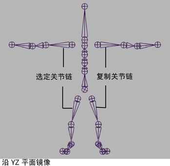 不能在“比例”(Scale)为 -1 的情况下使用“编辑 > 复制”(Edit > Duplicate)创建关节链的镜像副本。请改用骨架 > 镜像关节(Skeleton > Mirror Joint)。