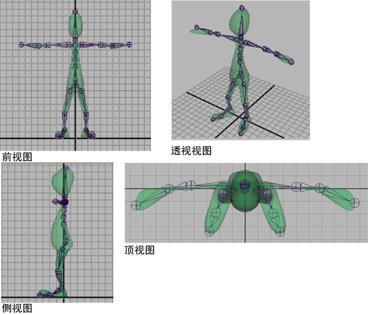 构建骨架时,使用多个摄影机视图可以确保骨架在全部三个维度上都能正确拟合其对象,判断骨架大小和形状时可以使用显示栅格作为参考。