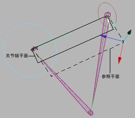 关节链平面是一个平面,它包含了关节链中所有关节并通过轴来设定姿势。关节链平面围绕控制柄向量旋转。操纵极向量时,关节链平面将围绕控制柄向量旋转。