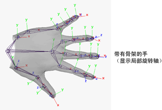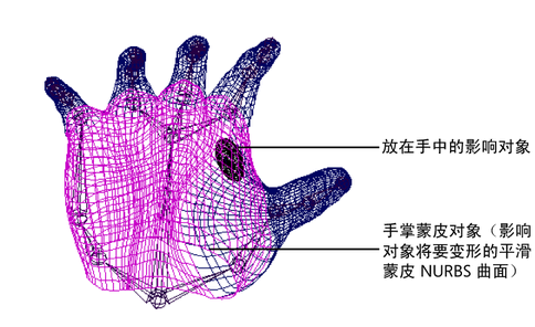 假设您为手创建一个模型。手由 NURBS 曲面构成,包括指尖、拇指和手掌区域的曲面。假设您还为手创建骨架,并刚刚通过平滑蒙皮将 NURBS 曲面绑定到骨架。