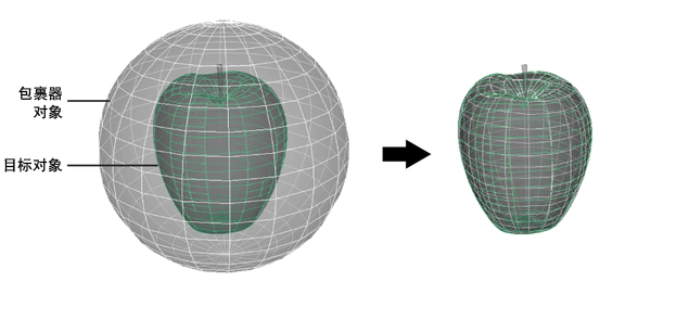 收缩包裹变形器允许您将一个对象投影到另一个对象的曲面。每个收缩包覆变形都包含以下内容: