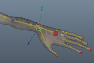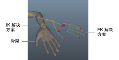 通过“HumanIK 控制”(HumanIK Controls)中的“IK 融合平移”(IK Blend T)和“IK 融合旋转”(IK Blend R)(以前称为“达到”(Reach))滑块,可以确定骨架遵循哪一个解决方案(IK 或 FK)。
