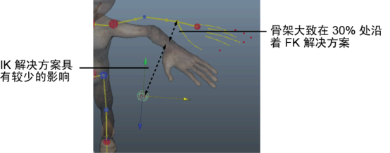 例如,为下图中的“IK 融合平移”(IK Blend T)指定了值 30%。当平移角色的腕部效应器时,骨架将贴近 FK 装备,因为与 IK 解决方案相比,它更加紧密地遵循 FK 解决方案。