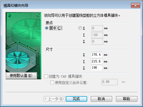 “模具镶块向导”是一种工具,用于围绕模型快速为立方体 CAD 模具或外表面建模以提高冷却分析的精度。