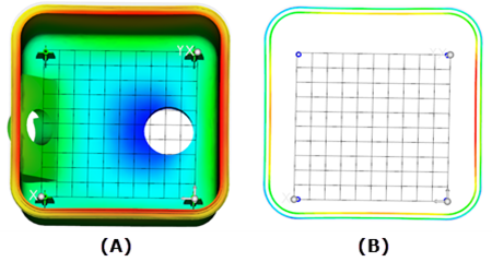 平行度与两个平面相关。锚系统在其中一个平面(它们必须平行)上设定,以便锚的 XY 平面可以定义平行平面中的一个。因此,Z 方向用于测量另一平面上的平行度公差。使用层或路径图分离具有平行度公差的区域,这通常是解释结果的最简单方式。在下图中,螺柱形成一个平行平面。密封表面形成第二个平面。螺柱(这是锚所在位置)和密封表面的顶部由层分离。变形比例已修改,因此可轻松标识密封表面上的最小和最大变形位置。