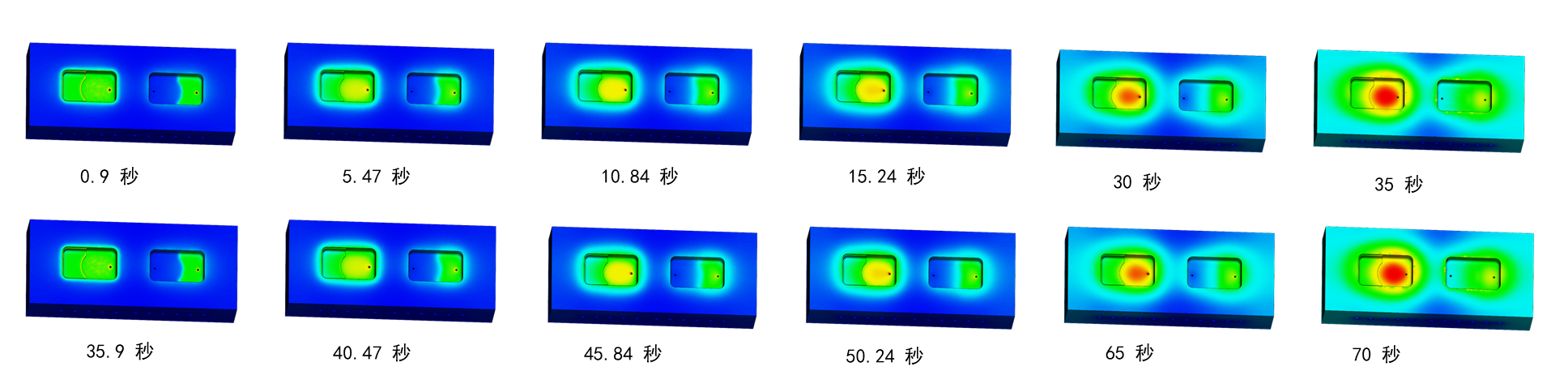 让我们看一下前面的模型示例(图 1)。该图 3 和图 4 显示两个相邻注射成型周期中旋转样板和固定样板的温度场图。