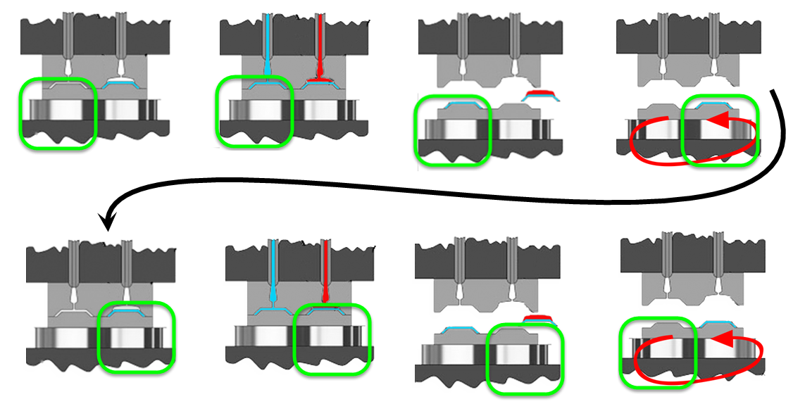 在图 3 中,第一行结果对应第一个周期:在左侧型腔注射第一次注射,而在现有的第一个零件的右侧型腔注射第二次注射。执行完第一个周期后,旋转样板便会旋转,如图 2 中所示。显示在图 3 的第二行中的结果表示重叠注塑周期时间中的第二个周期时间。图 2 绿色部分显示在屏幕左侧。