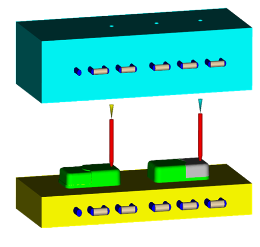 在本示例中,二次注射的聚合物材料均为聚丙烯,模具为 P20 工具钢。第一次注射的熔体温度为 240 度,第二次注射的熔体温度为 180 度。周期时间为 30 秒,模具打开时间为 5 秒。