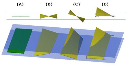 在下图中,显示了相较于原始零件(绿色)的扭曲零件(黄色零件)的三个示例。翘曲公差根据基准面定义为 +/- 5.0 mm。该图的上半部分是前视图,下半部分显示了旋转后的零件。三个扭曲零件都相同。它们的区别在于与 +/- 5.0 mm 公差有何关联。