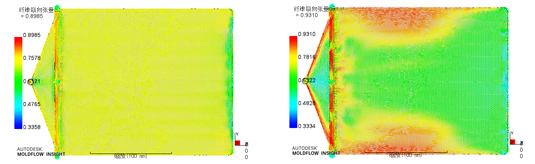 将喷泉流结合到纤维取向预测中可产生与表皮层中的实验数据非常吻合的结果。翘曲预测结果也受到此改进的影响。此修改对内部取向结果影响不大。