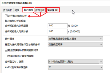 若要访问这些功能,请确保已选择“粉末注射成型”作为成型工艺。单击 (“主页”选项卡 > “成型工艺设置”面板 > “工艺设置”)。单击“高级选项”,然后单击与求解参数相关联的“编辑”。