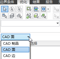 编辑 CAD 几何图形或在 CAD 几何图形上设置网格密度时常用的 CAD 几何图形过滤器,已在“几何图形”、“网格”和“优化”选项卡的“选择”面板中有了自己的图标。