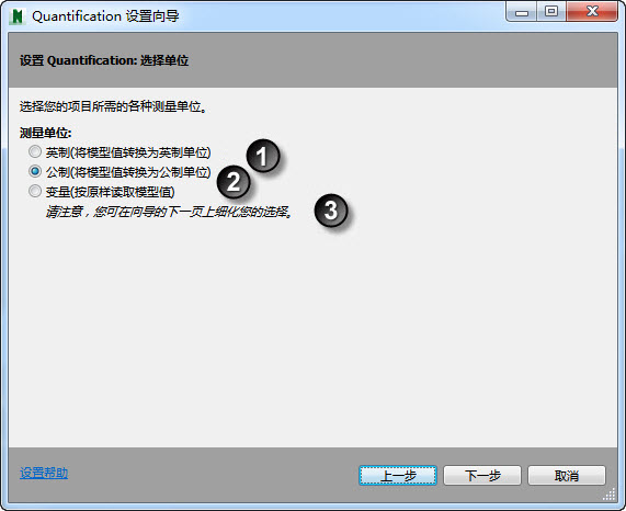 3. 变量:使用现有的模型值。您可以在下一向导页面中更改每个单独算量属性的单位。
