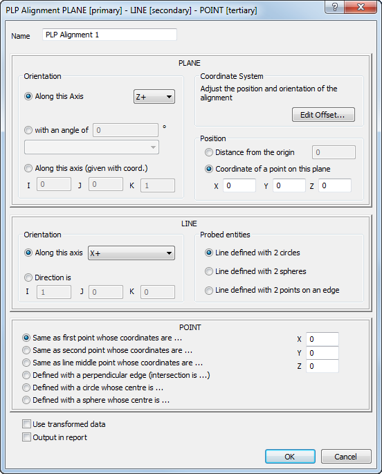 PLP alignments enable you to align the part to the CAD model using a plane, line and point for which you know the nominal coordinates. You do not need to use or create geometric items to measure the alignment, but the features you use must lock all six degrees of freedom. For example, the: