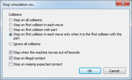 - Stop on all collisions to display an error message and suspend the simulation for every collision with the part.