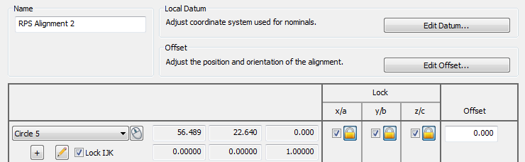 - Select the geometric items you want to use for the alignment. In the following example, three translation axes and two rotational axes are locked by Circle 1 because the whole feature is used and Lock IJK is selected,